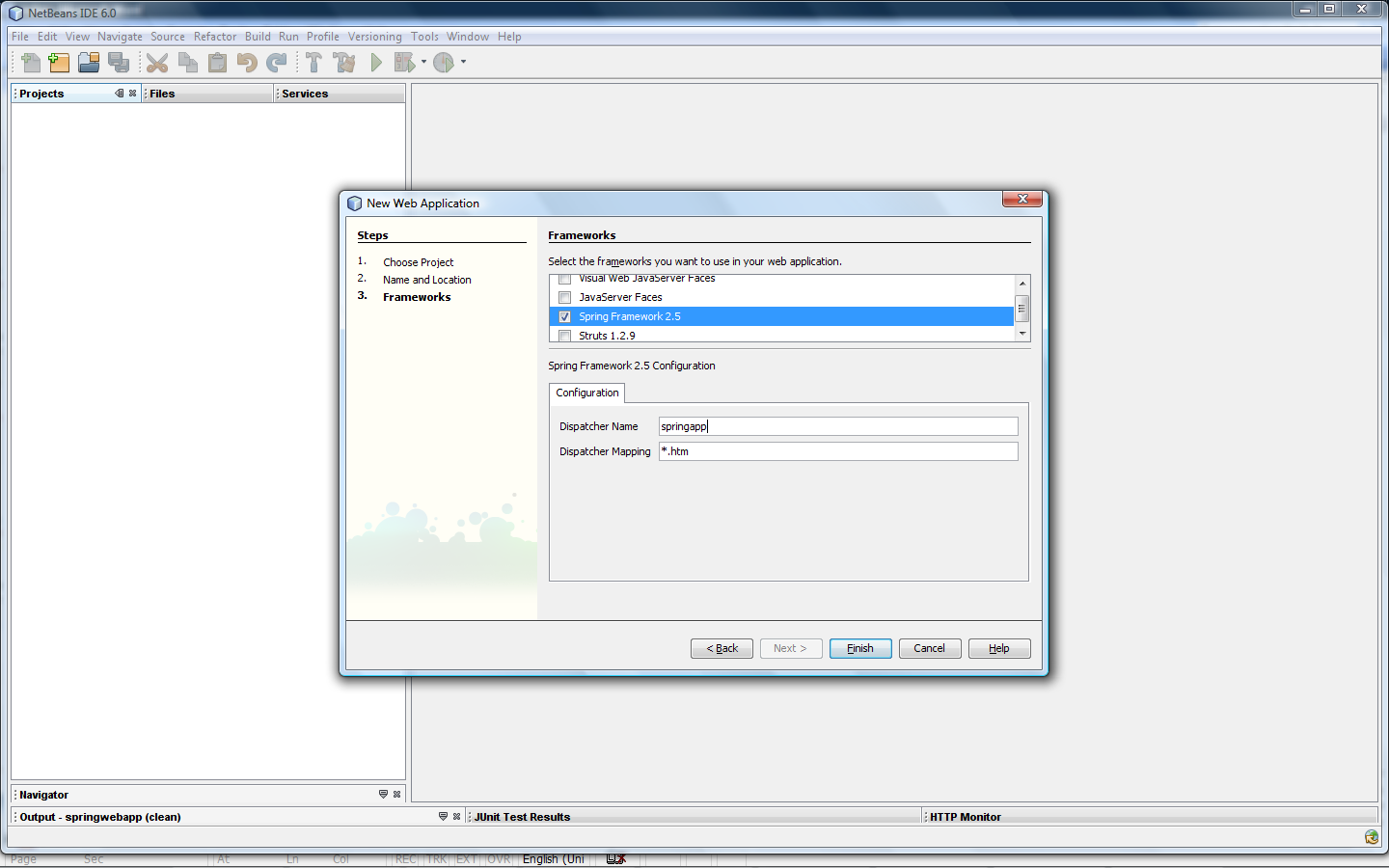 Select the framework as “Spring Framework 2.5” and enter “springapp” as the dispatcher name and click Finish.