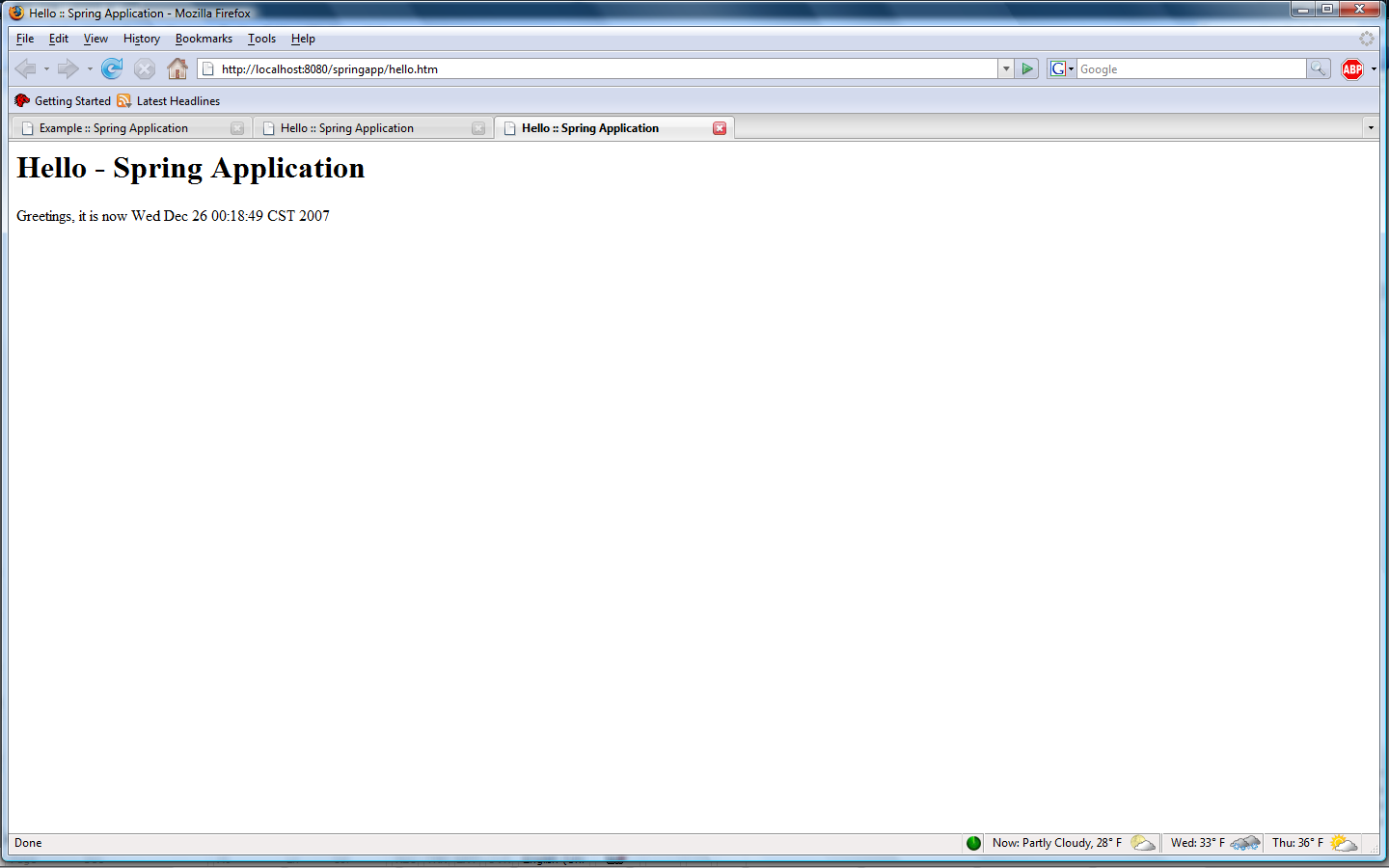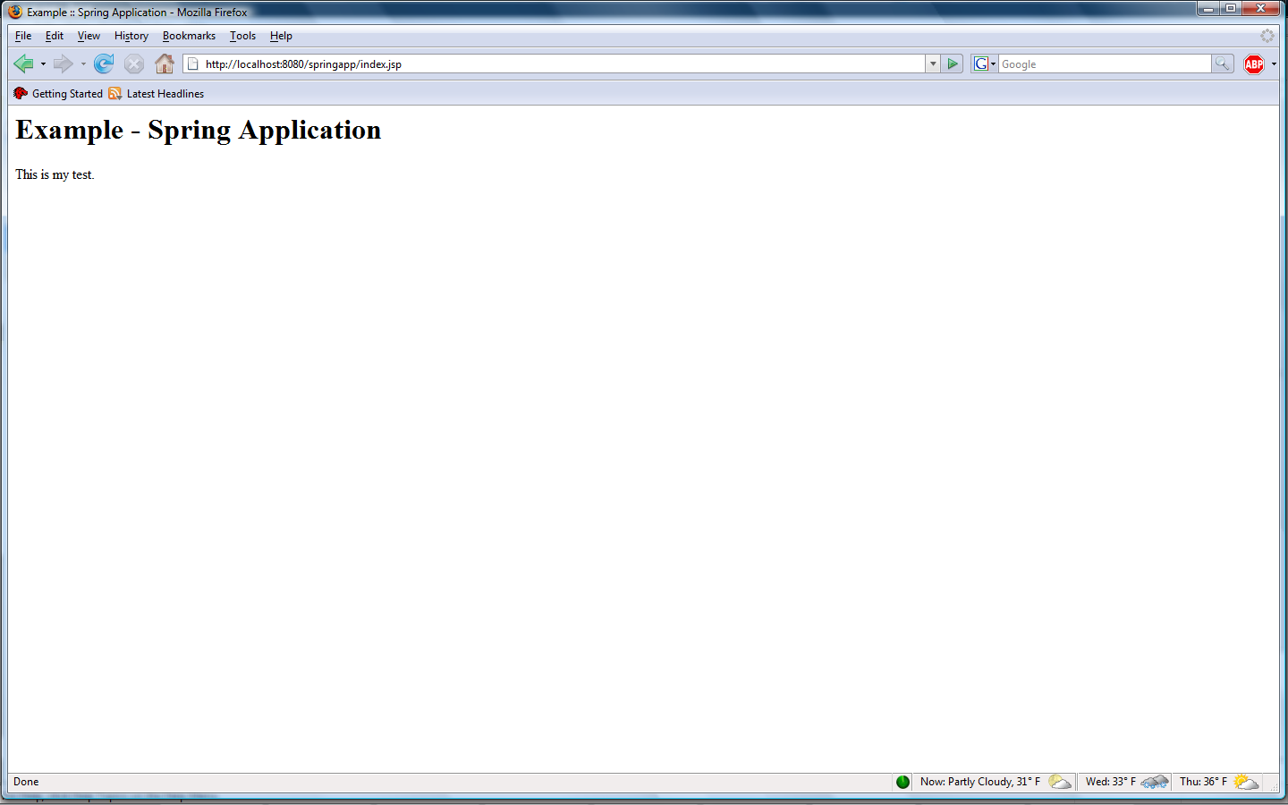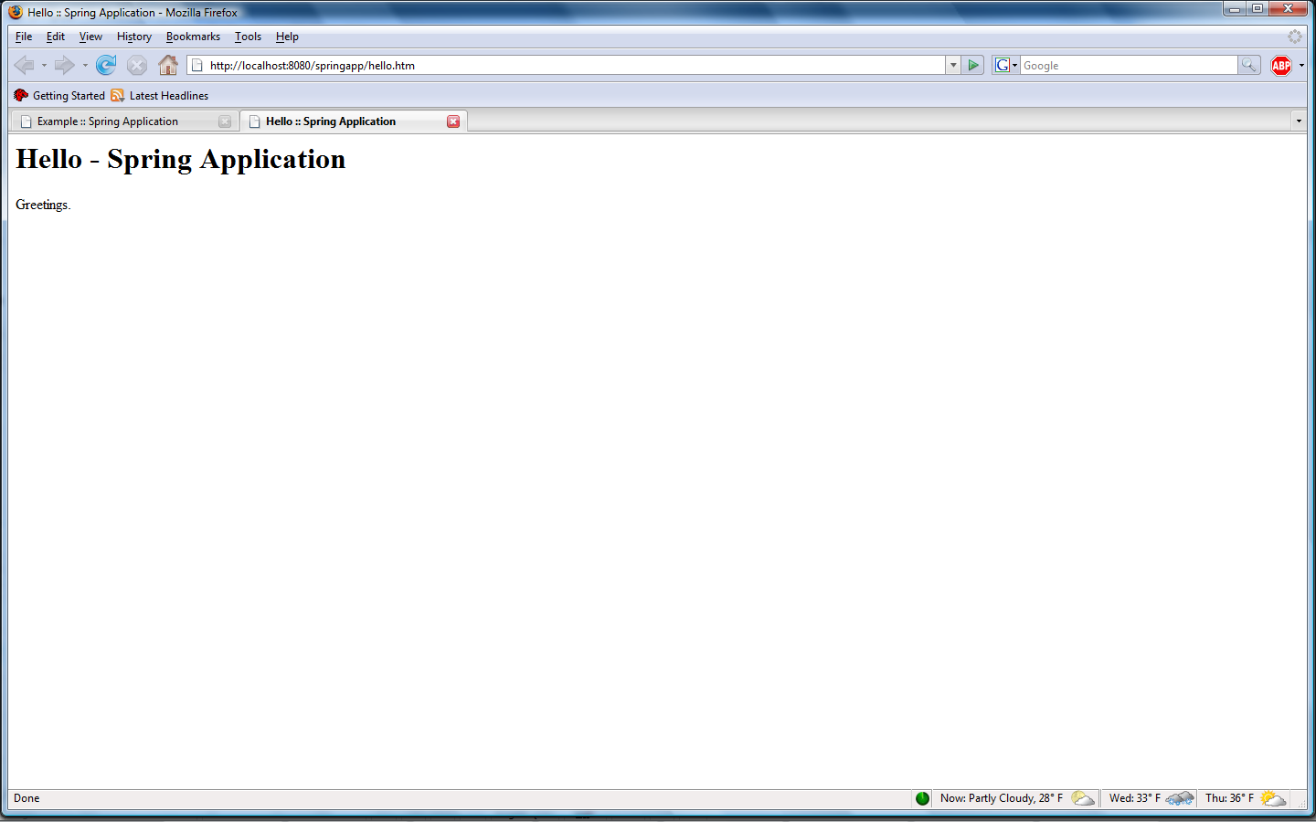 The server is already started when the application was deployed in the previous step. You can now open up a browser and navigate to the starting page of our application at the following URL: http://localhost:8080/springapp/index.jsp .