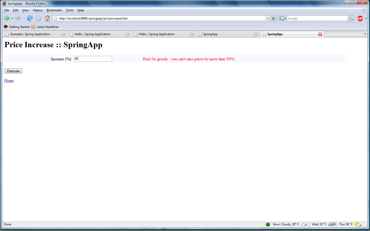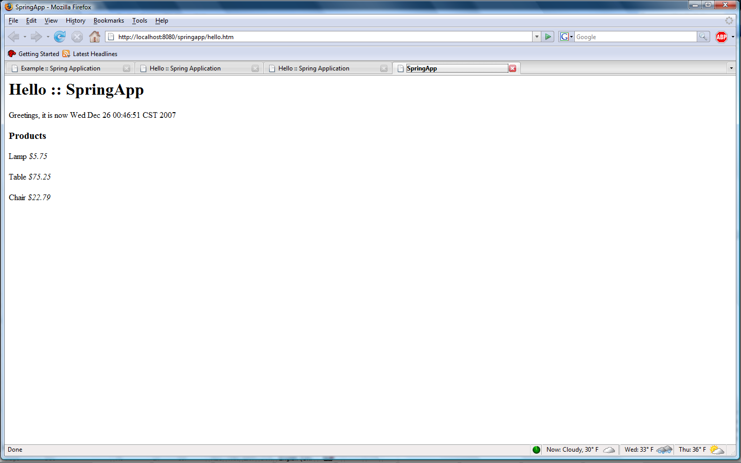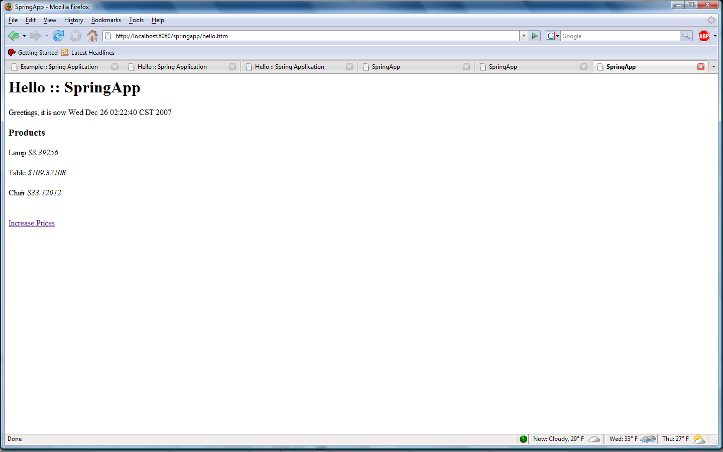 The server is already started when the application was deployed in the previous step. You can now open up a browser and navigate to the starting page of our application at the following URL: http://localhost:8080/springapp/index.jsp .